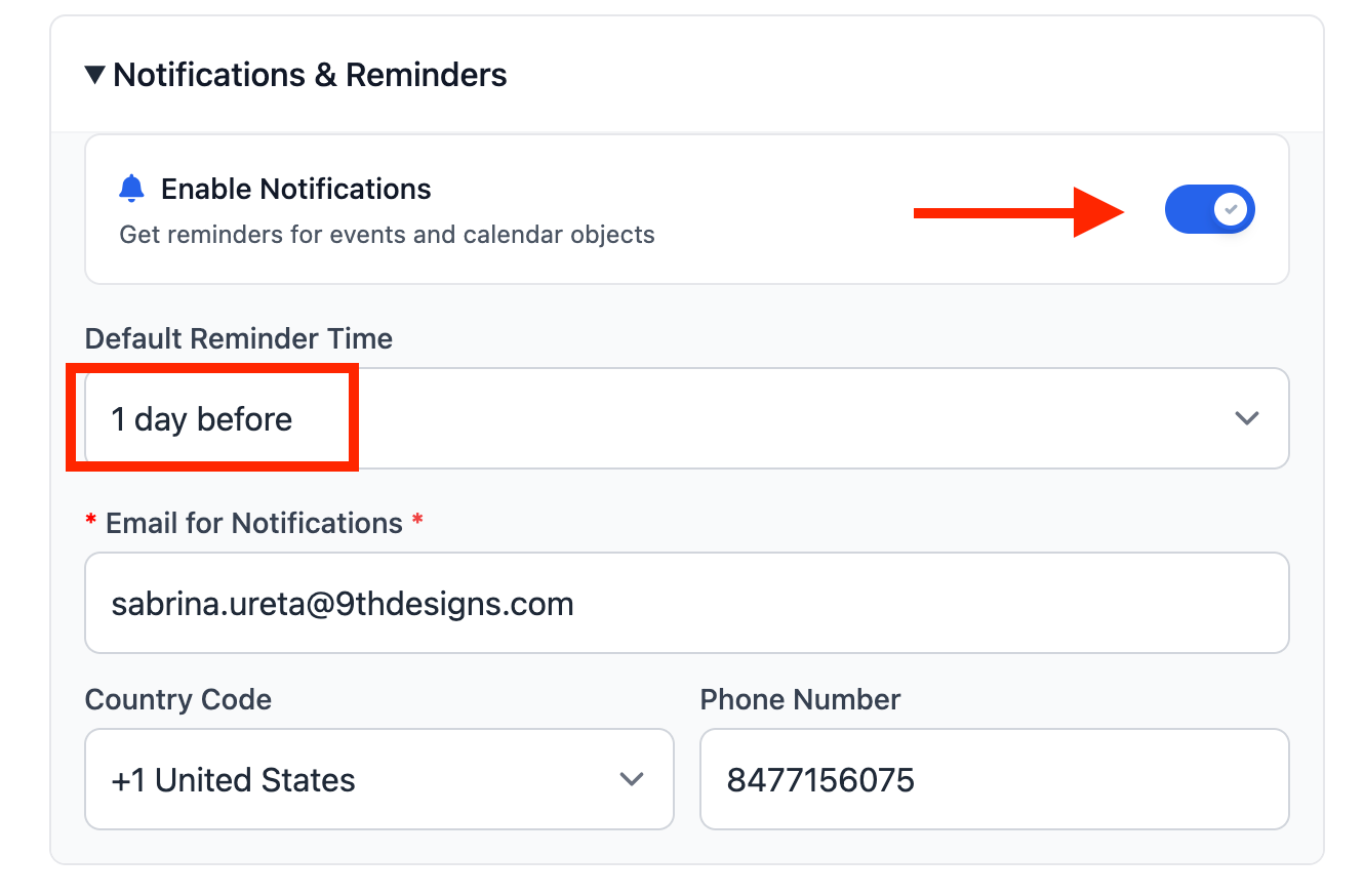 Set Notifications & Reminders for events on your calendar. If you enable this, you can set the duration of your reminders connected to your email and phone number.&#x20;