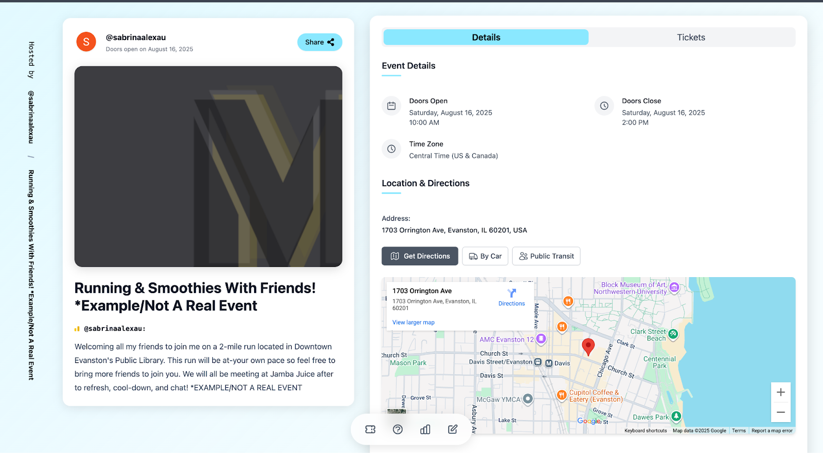 → EX: “Welcoming all my friends to join me on a 2-mile run located in Downtown Evanston's Public Library. This run will be at-your own pace so feel free to bring more friends to join you. We will all be meeting at Jamba Juice after to refresh, cool-down, and chat!”